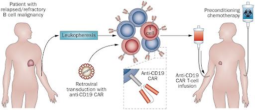 Đây là liệu pháp miễn dịch điều trị ung thư sử dụng CAR-T cell đầu tiên được FDA (Mỹ) phê duyệt sử dụng trên người bệnh vào năm 2017. Hiện nay, liệu pháp này được dùng để điều trị cho trẻ em và thanh niên mắc bệnh bạch cầu lympho cấp tính dòng B (B-cell ALL) mà bệnh không đáp ứng với các phương pháp điều trị khác hoặc đã tái phát lần hai trở lên.Phương pháp điều trị bằng CAR-T cell thường sử dụng chính tế bào T của người bệnh. Bước đầu tiên, các tế bào T trong máu của bệnh nhân sẽ được lấy ra và nuôi cấy trong phòng thí nghiệm. Ở bước này, các tế bào T sẽ được biến đổi gen bằng virus mang đoạn DNA đã được thiết kế sẵn. Tế bào T sau khi được biến đổi gen sẽ biểu hiện thụ thể kháng nguyên nhân tạo (CAR) để gắn kết với kháng nguyên đặc hiệu trên tế bào ung thư.Trong trường hợp của sản phẩm Kymriah, thụ thể này là CAR nhận diện kháng nguyên CD19 (anti-CD19 receptor). Sau khi các CAR-T cell được nhân lên đủ số lượng, chúng sẽ được truyền trở lại vào máu của người bệnh. Tuy nhiên, trước khi tiếp nhận các tế bào này, bệnh nhân sẽ được điều trị hóa trị để giảm tối đa lượng tế bào ung thư máu, giúp CAR-T cell hoạt động hiệu quả hơn (Hình 3).Hình 3: Quy trình lấy tế bào T từ bệnh nhân, biến đổi gen để biểu hiện CD19 trên bề mặt và đưa trở ngược lại người bệnh. Nguồn hình ảnh: Nat Rev Clin Oncol. 2014 Dec;11(12):685-6Cụ thể các bước trong quy trình tạo ra sản phẩm Kymriah như sau: